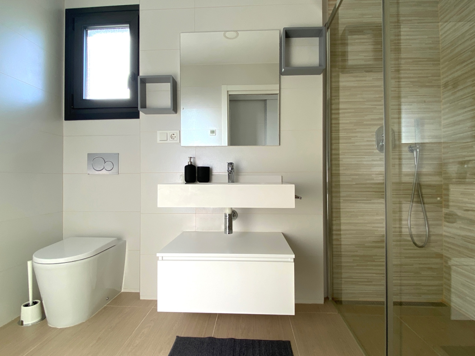 Binnen vind je een lichte woon- en eetkamer die verbonden is met een moderne keuken met ontbijtbar, volledig uitgerust met Bosch-apparatuur. Er zijn twee slaapkamers, elk met een eigen badkamer, en naast de keuken bevindt zich een praktische wasruimte met plaats voor wasmachine en droger.