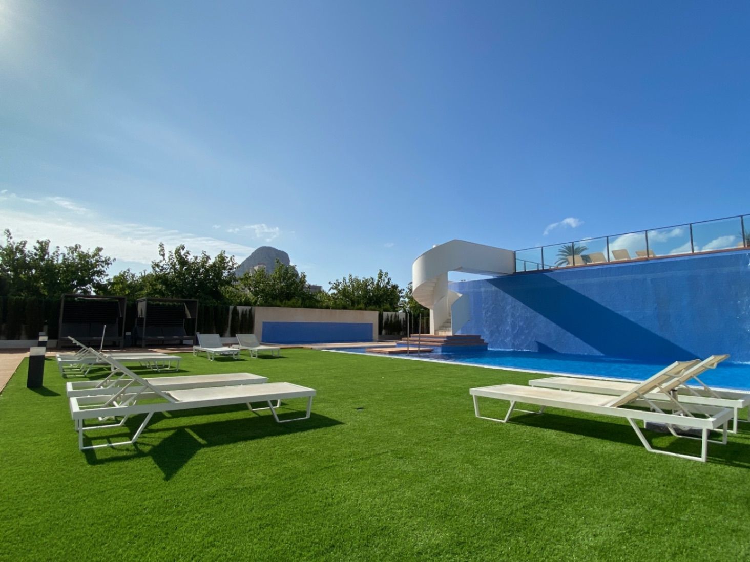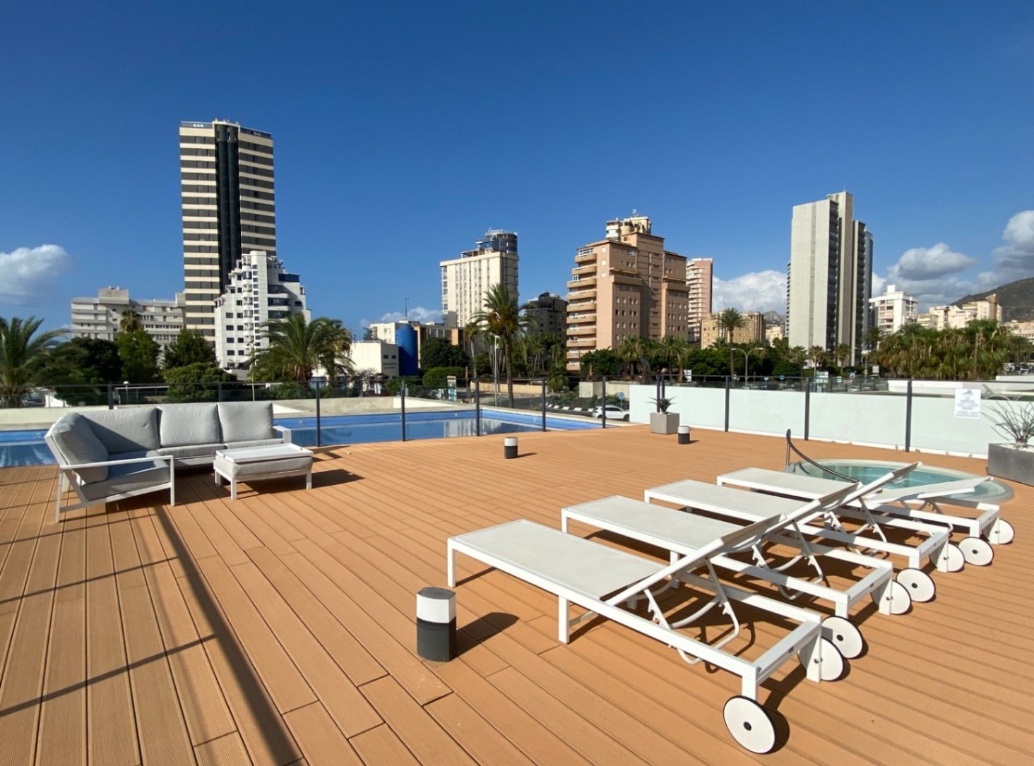Het terras van 17 m² sluit aan op zowel de woonkamer als de hoofdslaapkamer. Hier geniet je de hele dag van de zon en van het uitzicht over Calpe, de zee en de indrukwekkende rots.