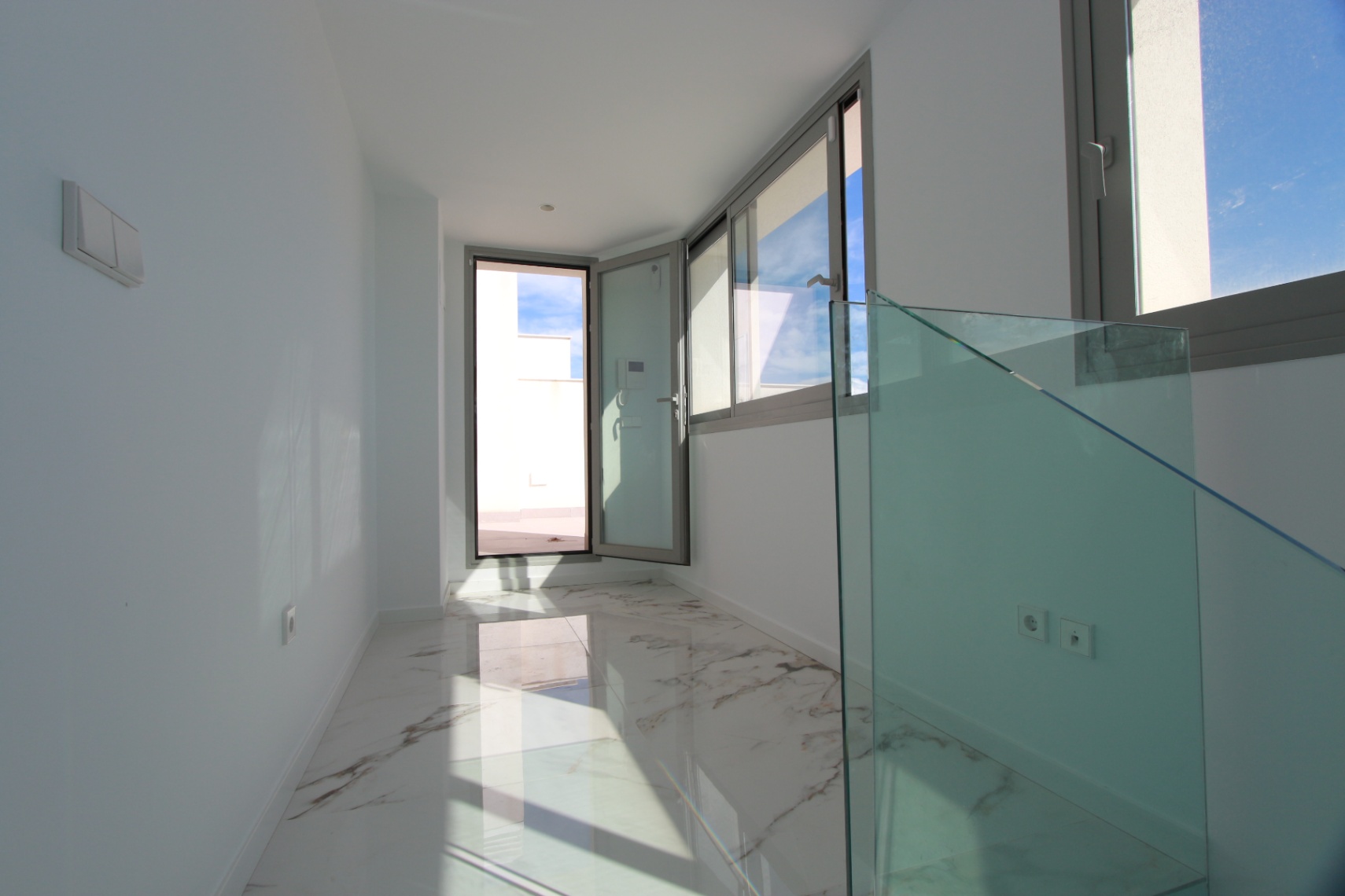 Een elegante binnentrap leidt naar de bovenste verdieping, waar een prachtig terras van 54 m² zich bevindt: een echt privé-oase om van het zeezicht te genieten, te zonnen, te lezen, te ontspannen of gewoon de schoonheid van de Middellandse Zee te bewonderen.