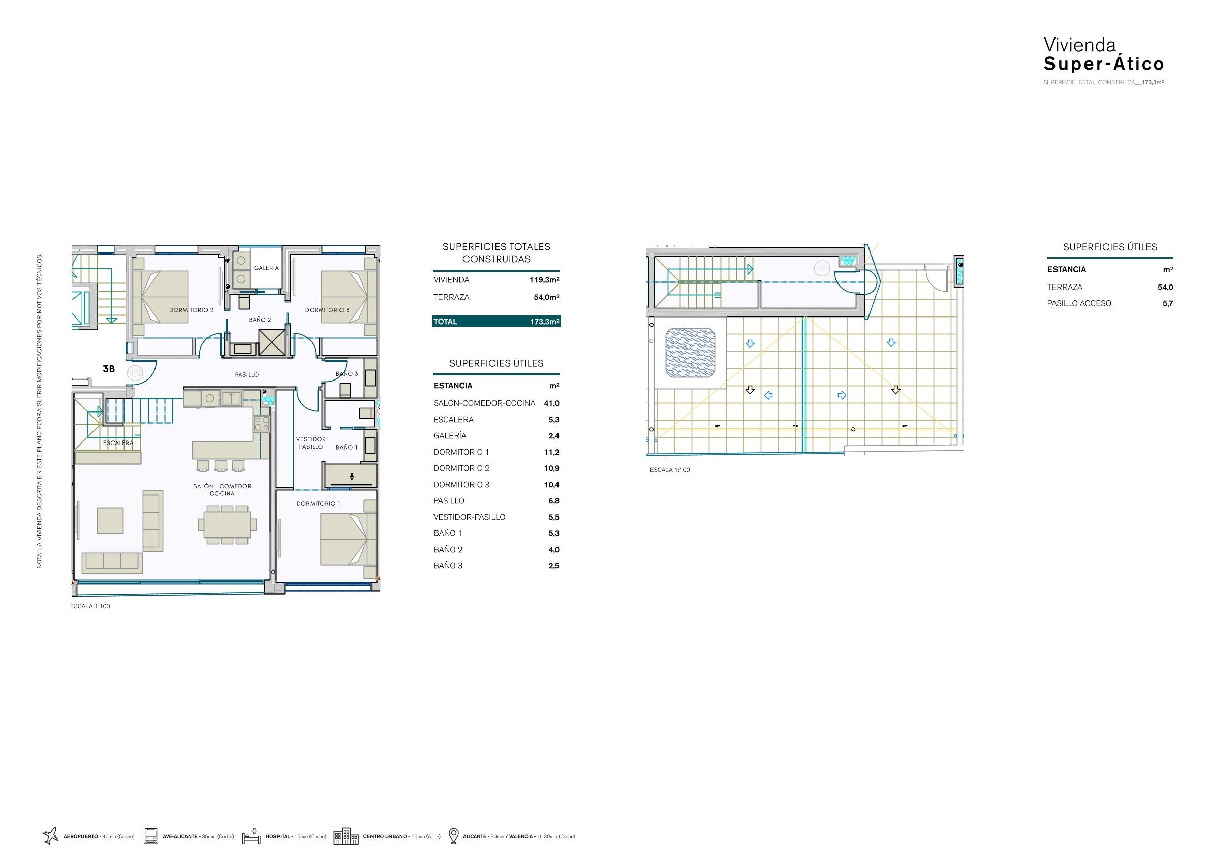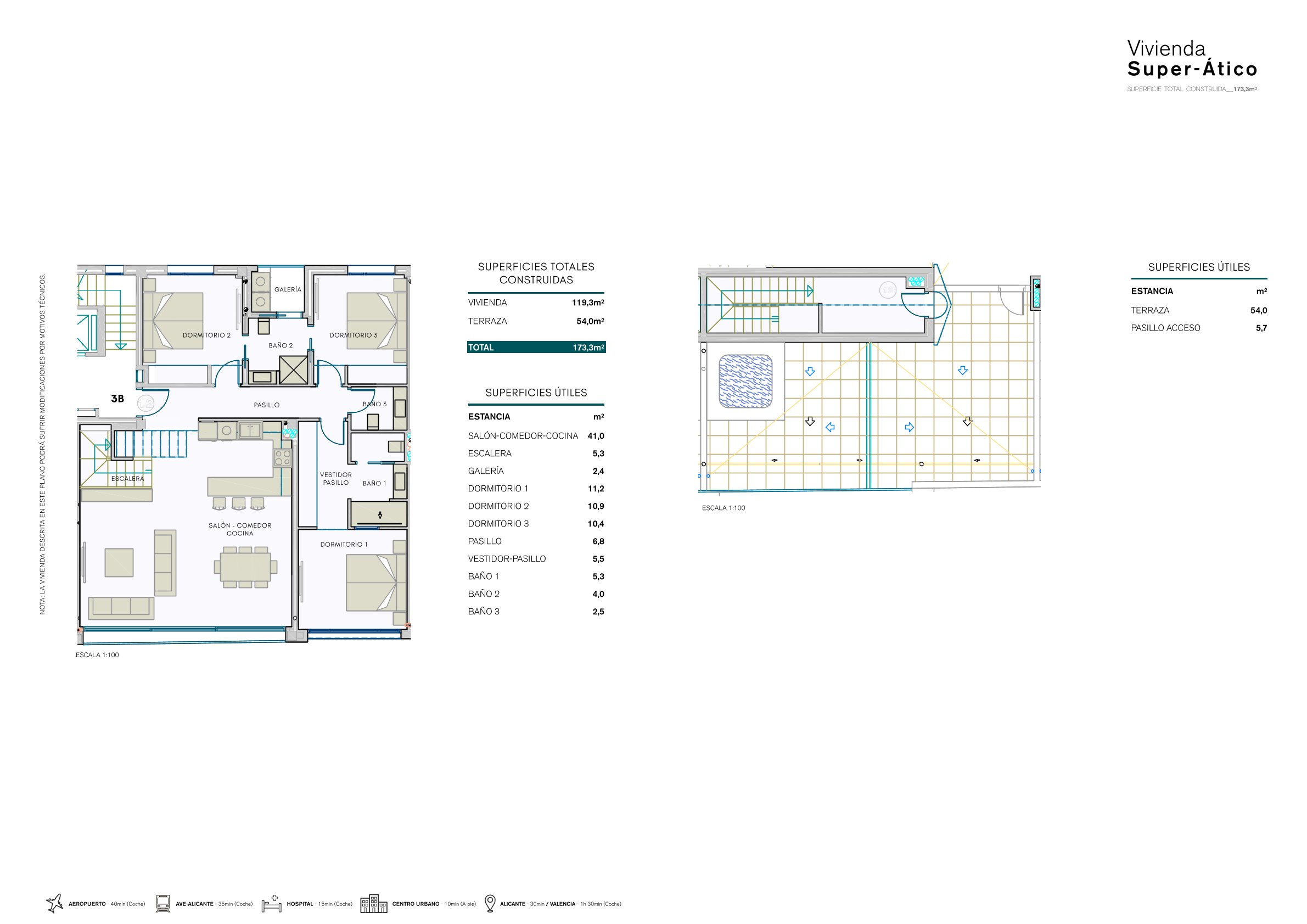 Dit spectaculaire penthouse/duplex, gelegen op de derde verdieping van het gebouw, heeft een totale bebouwde oppervlakte van 173,30 m² (119,30 m² binnen + 54 m² terras), verdeeld als volgt: